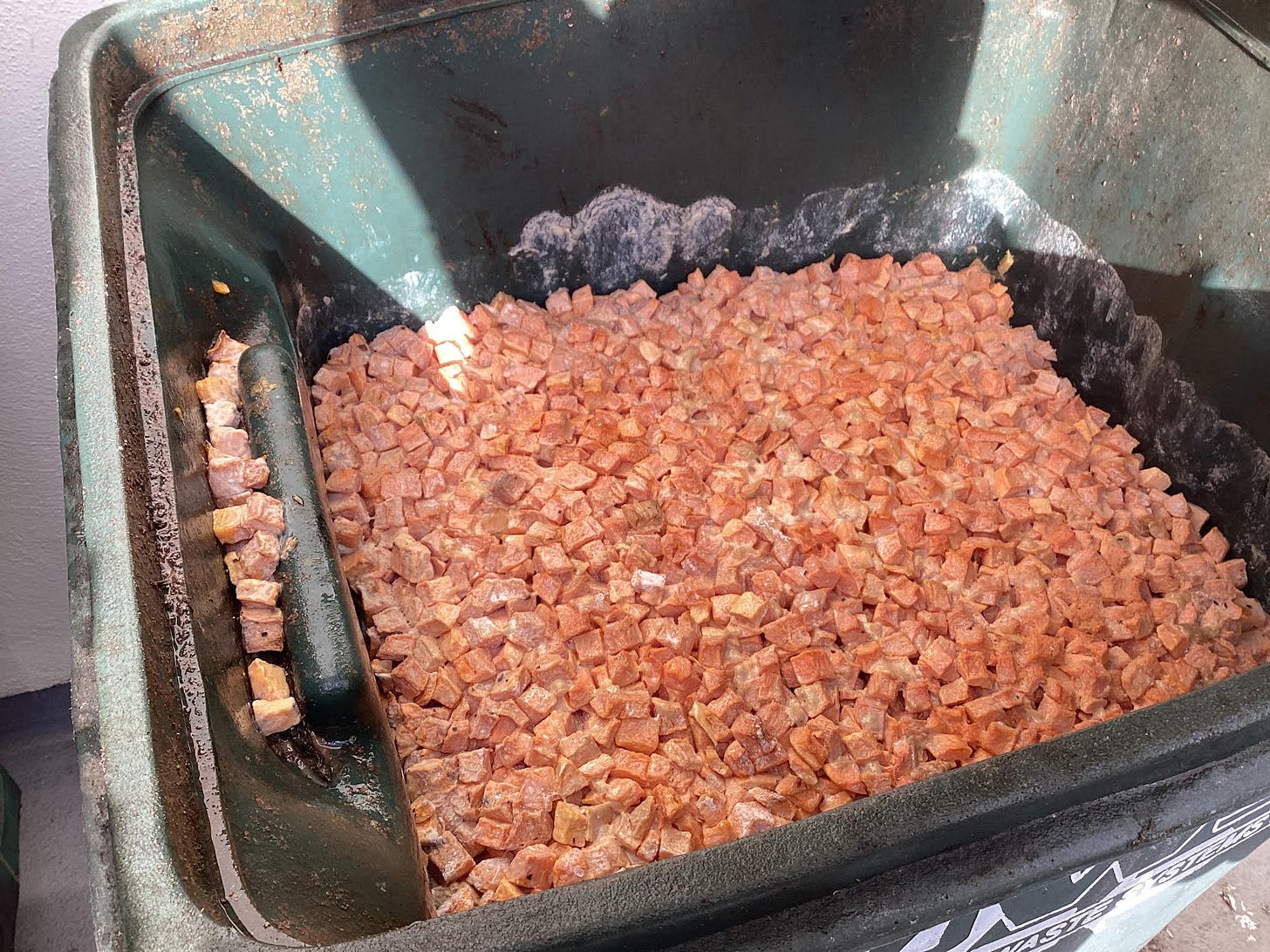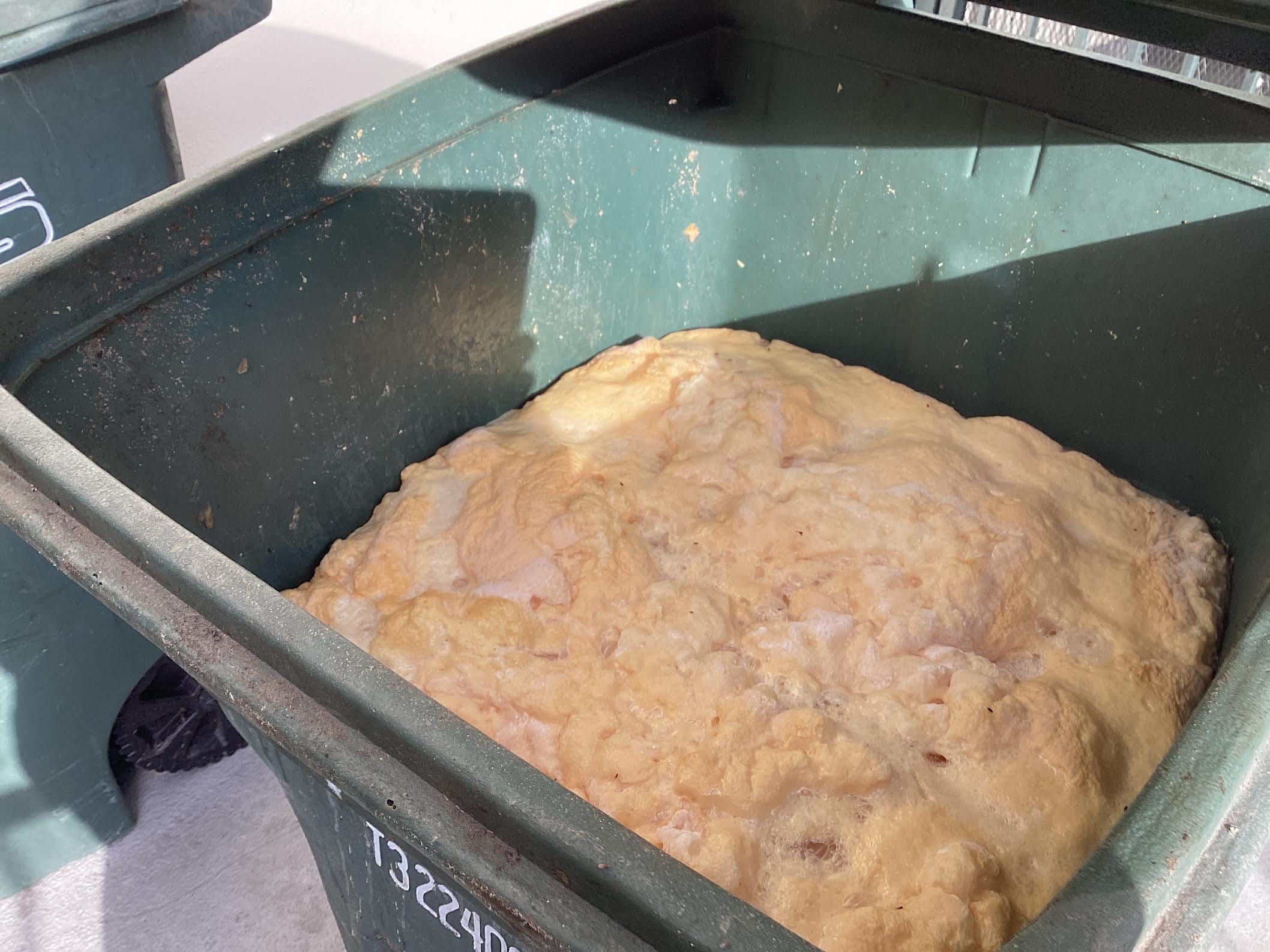My best guess as to the situation we encountered in the green bin is the perfection of the microbial environment we had accidentally created. Butternut squash is rich in both sugars and water, an abundant and easy food source for bacteria and other microbes, like yeasts and fungi. As all those microbes began to go to work on all that squash, breaking down those sugars, they would be respiring carbon dioxide. The sheer volume of microbial activity would produce more and more gas, forming more and more bubbles.